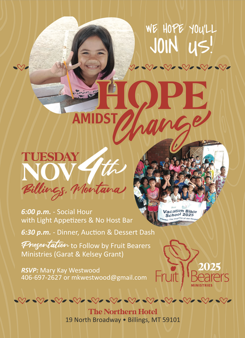 You are invited to join us at our end of the year Fruit Bearers Banquet in Billings, Montana on November 4th, 2025. This Banquet has become a staple this time of year to our supporters in Billings. We are really looking forward to it.
